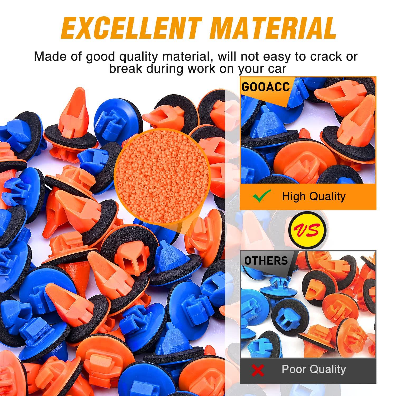 Package: Including 50pcs Rocker Moulding Clip With Sealer (blue), 50pcs Wheel Flare Moulding Clip With Sealer (orange), total 100pcs Fender Flare Clips
