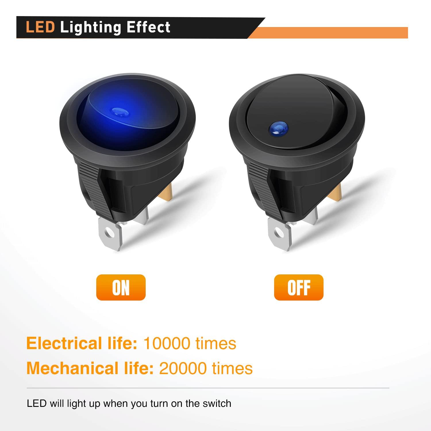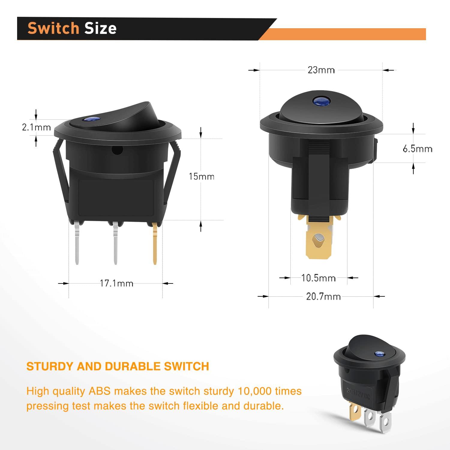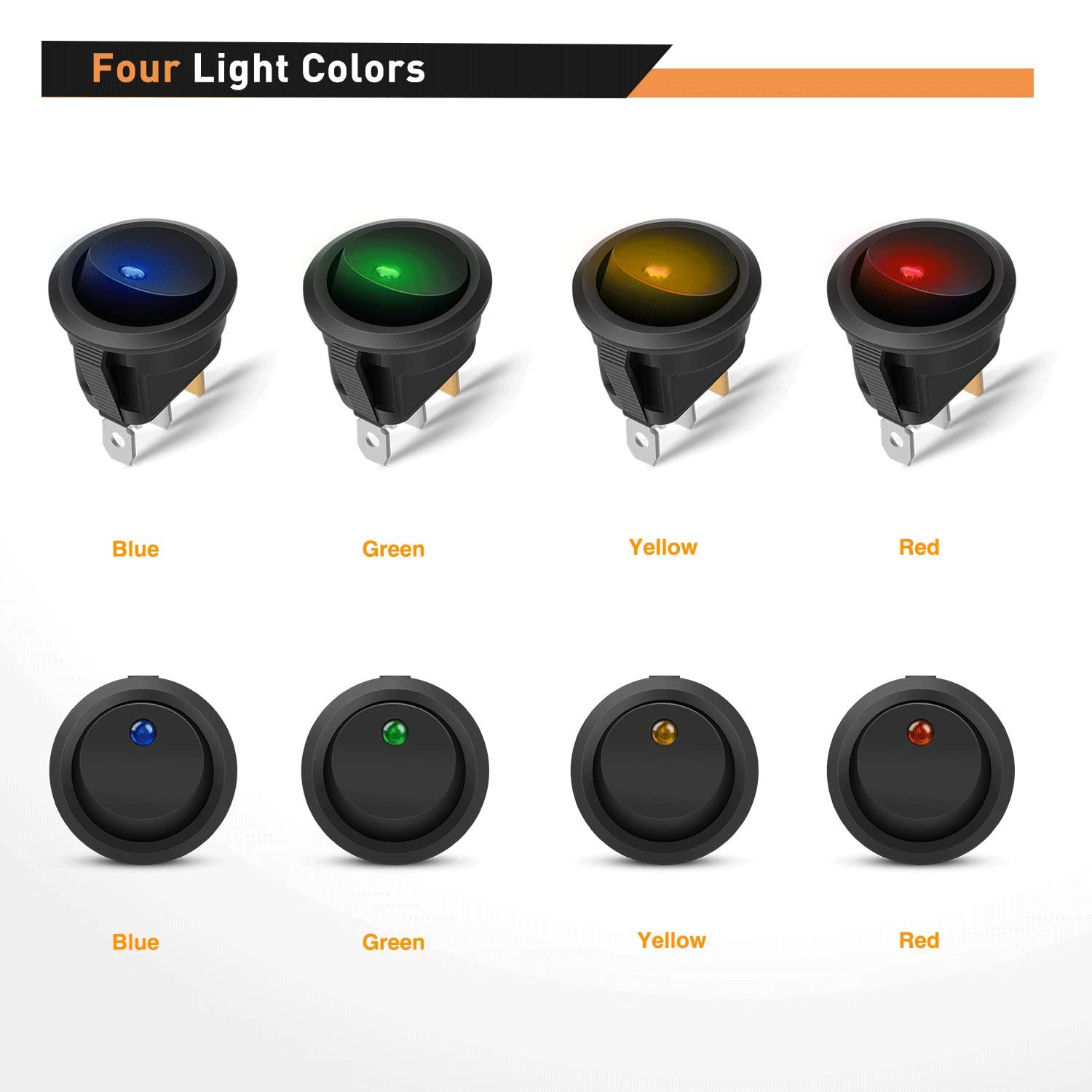 These Round switches are especially suitable for 12 volt installations.They are currently used in cars, boats, racing cars, off-road vehicles, RVs, heavy trucks, ATVs and anything that uses a 12 volt power supply. Made from sturdy material that ensures long lasting durability, facilitate easy installationModel: Ship type switch KCD1Electrical life: 10,000 (times)Contact resistance: 50 (mΩ)Insulation resistance: 100 (MΩ)SPST :2 pole design (On/Off) 3rd poles with LED to be connected to earthMaterial: plastic metalSpecifications: SPST: ON-OFF Rating: 12VIllumination: DOT styled, 12V LED LightApplicable for car, motorcycle, boat, water dispenser etcPackage Included: 3 x Round Rocker Switch with Blue LED 3 x Round Rocker Switch with Red LED 3 x Round Rocker Switch with Green LED3 x Round Rocker Switch with yellow LEDPrecautions: For electrical maintenance installation, it is important to ensure that operators hold electrical qualificationsAnd take necessary power-off, insulation protection measures.
