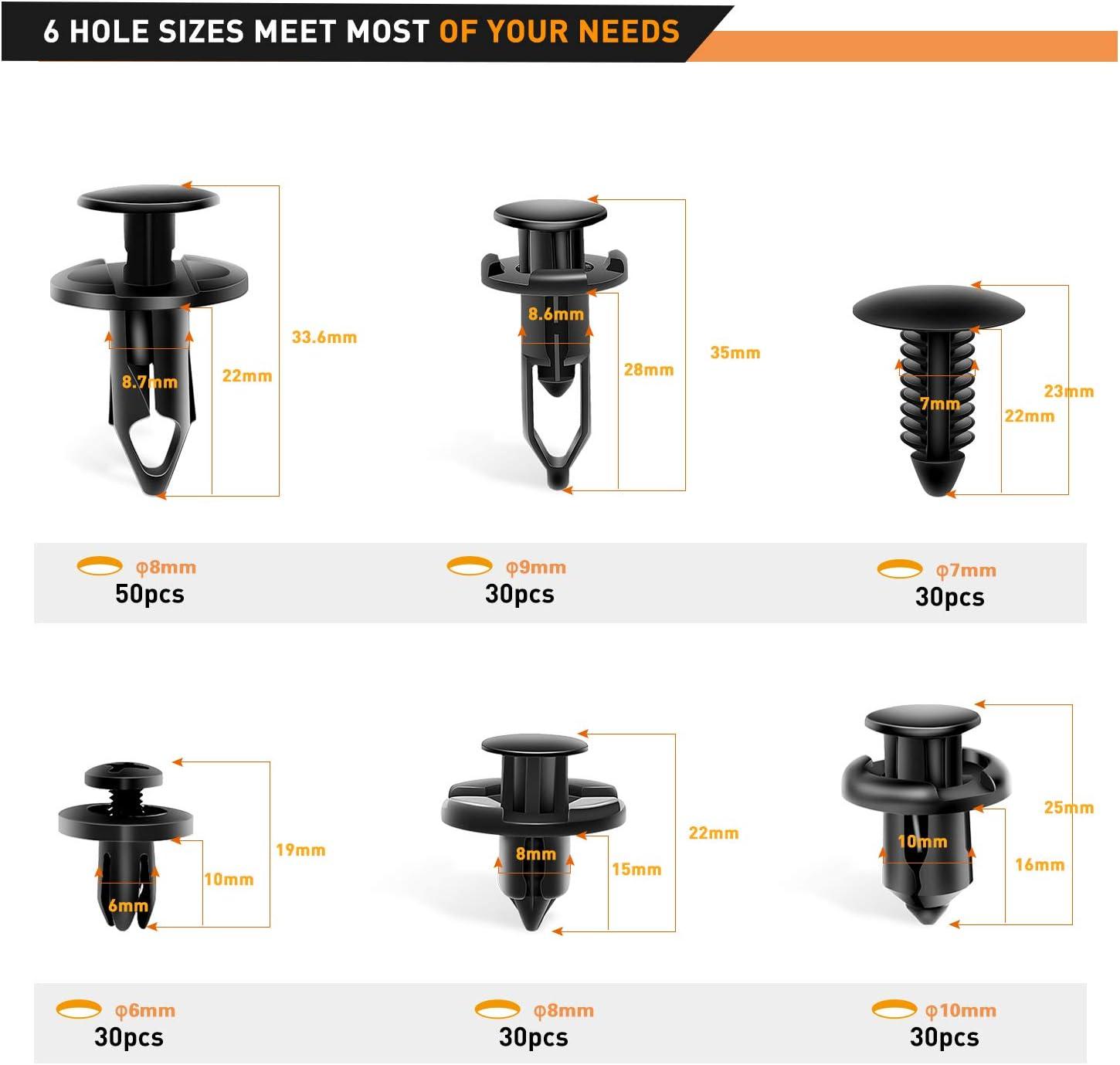 UNIVERSAL FIT KIT – Great Assortment Push Retainer Kit with 6 popular size, fitting for door trim, radiator shield yoke, fender, bumper and splash shield retainers replacement for Ford, GM, Chrysler, Toyota, Honda and more.